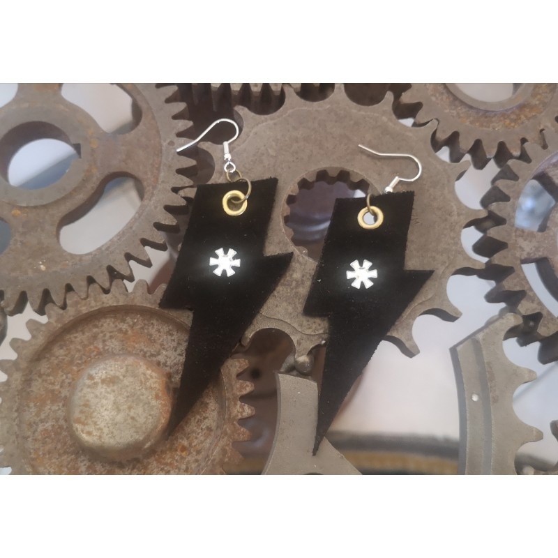 Boucles d'oreilles faites main en cuir nubuck noir, forme éclair réglementées d'un strass étoilé blanc.