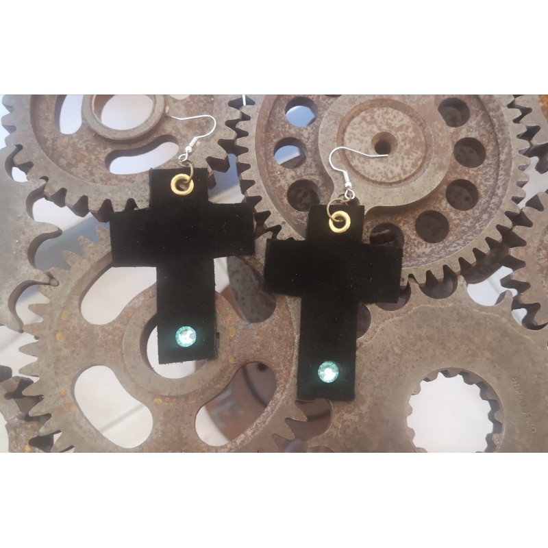 Boucles d'oreilles faites main, en cuir nubuck noir, forme croix agrémentées d'un strass bleu.