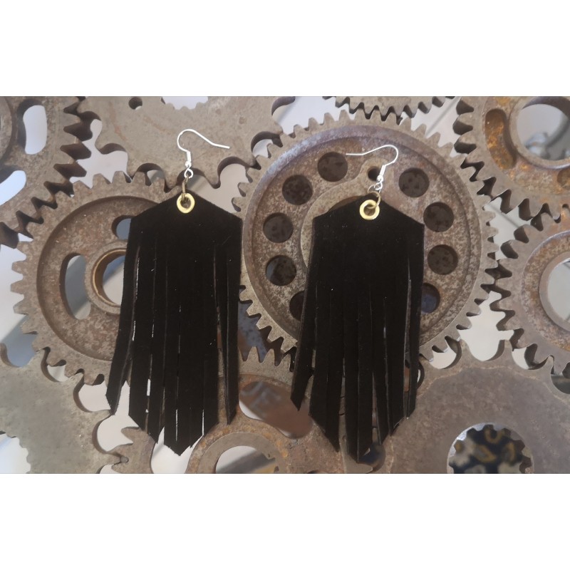 Boucles d'oreilles faites main, en cuir nubuck noir, modèle à franges.