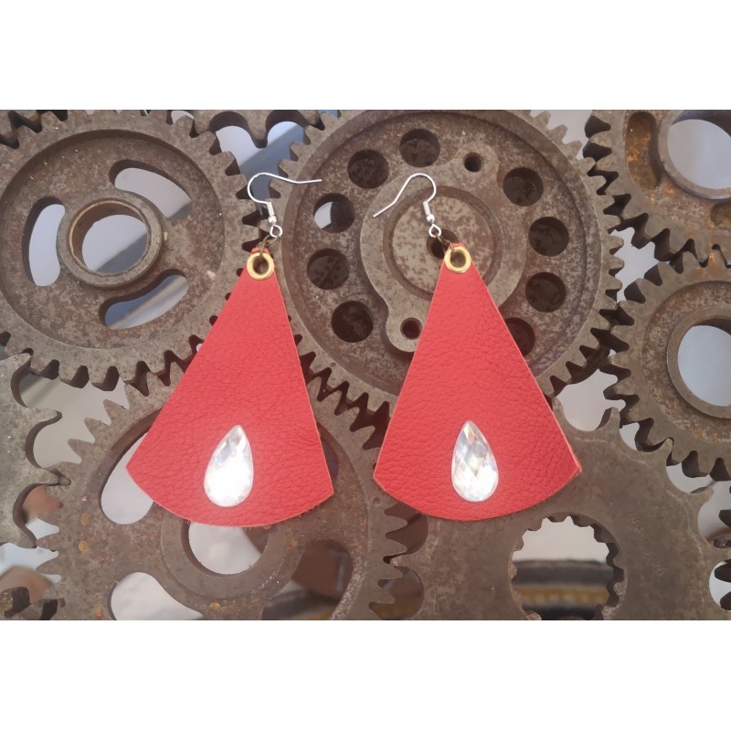 Boucles d'oreilles faites main, en cuir rouge, agrémentées d'un strass blanc forme goutte d'eau.